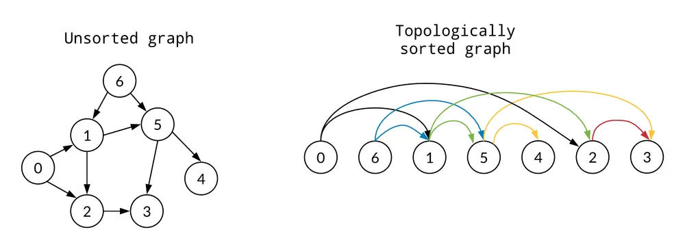 위상정렬은 방향 그래프(directed graph)에서 정점들을 선형으로 나열하되, 모든 간선 (u, v)에 대해 정점 u가 정점 v보다 앞에 오도록 정렬하는 알고리즘. 즉, 방향 그래프의 정점들을 간선의 방향을 거스르지 않도록 일렬로 나열하는 것.
