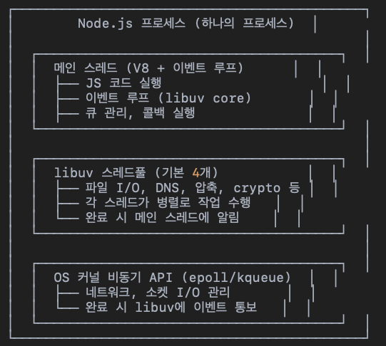 | 4. 스레드 병렬 계산 불가 | JS 코드 자체는 병렬 실행이 아님 (Worker Threads 필요) |